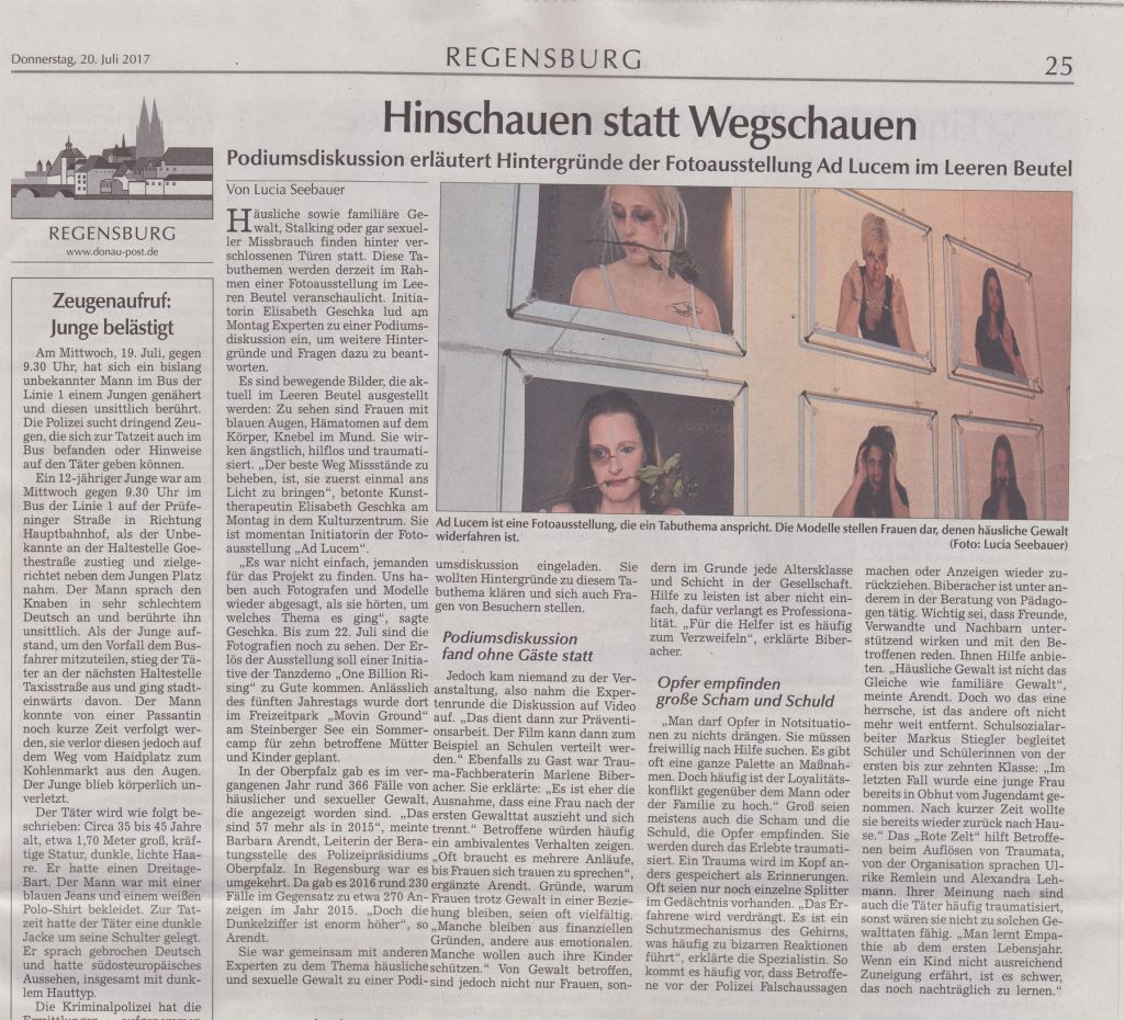 Die mit Hilfe der Ausstellung AD LUCEM und einem Charityfotoshooting gesammelten Spenden wurden am 20. März 2018 an das Frauenhaus Regensburg übergeben.