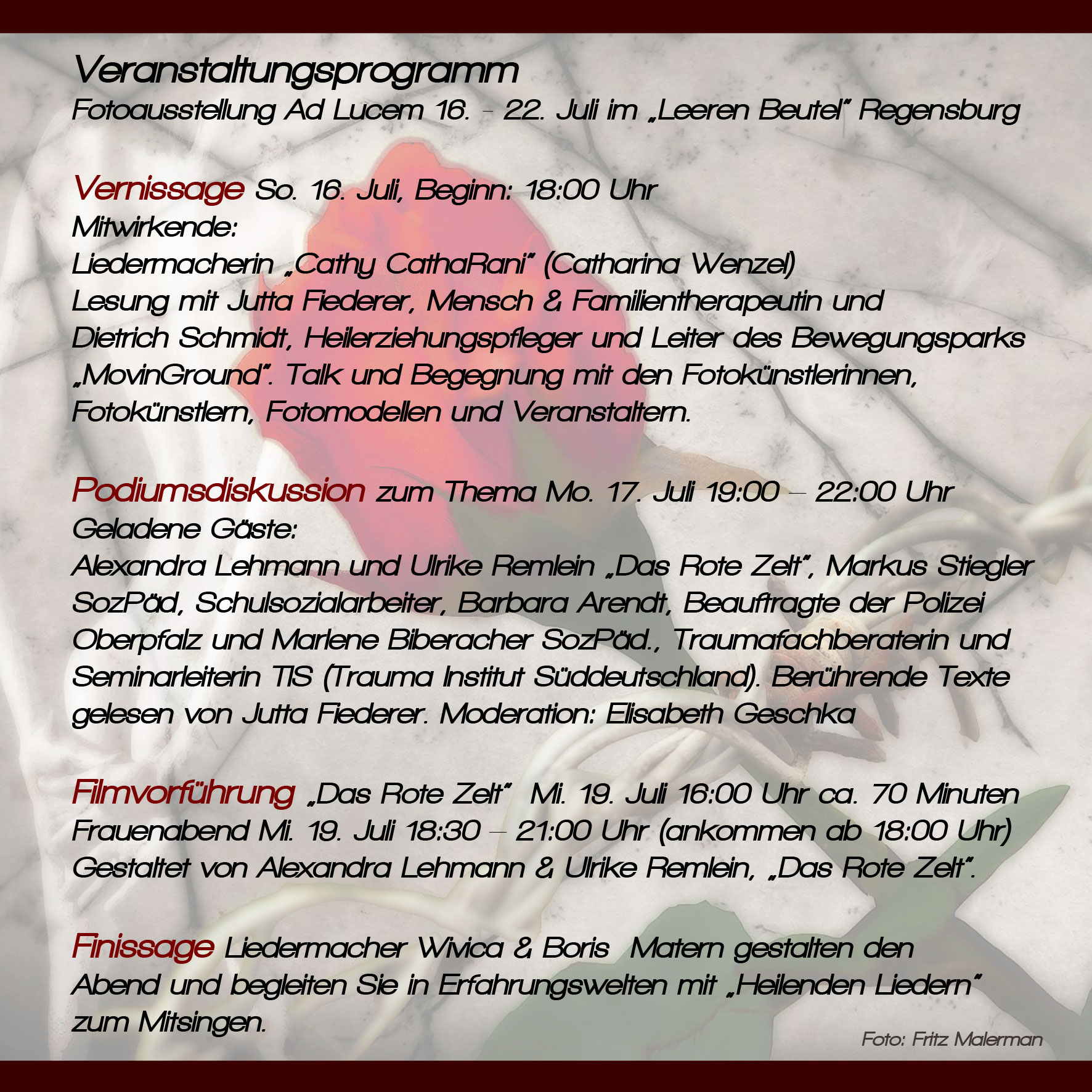 Eine Ausstellung, die bewegt und zum Nachdenken anregt. Durch die freie Assoziation jedes einzelnen Künstlers wird der Betrachter von Foto zu Foto überrascht und immer von Neuem mit dem TABU-Thema konfrontiert.