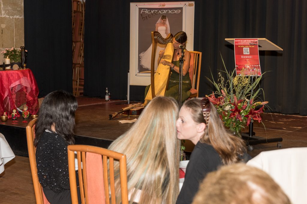 Kontrast zu der „schweren Kost“ kam von der Liedermacherin „Cathy CathaRani“ (Catharina Wenzel), die mit Leichtigkeit und Leidenschaft mit ihrer Harfe und ihren Liedern eine entspannende Atmosphäre schaffte.